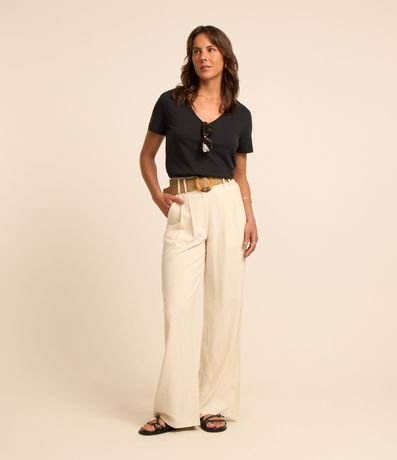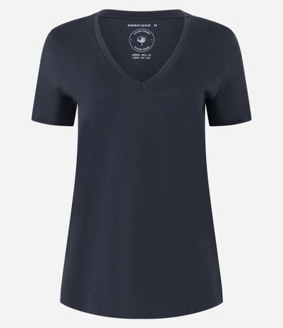 Blusa t-shirt básica feminina, confeccionada em algodão peruano, com decote V e mangas curtas.