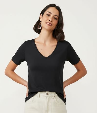 Blusa t-shirt básica feminina, confeccionada em algodão peruano, com decote V e mangas curtas.
