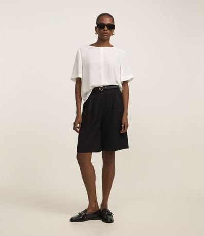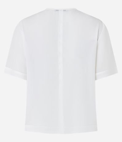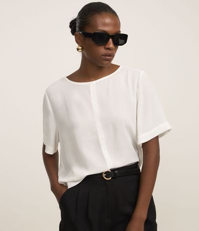 Blusa feminina de gola redonda, confeccionada em crepe, com mangas curtas e costura frontal.