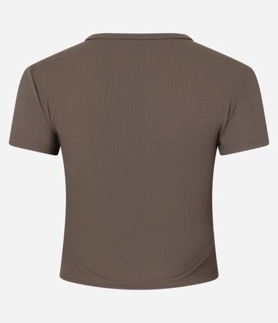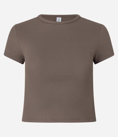 Blusa básica feminina confeccionada em poliamida, com gola redonda e mangas curtas.