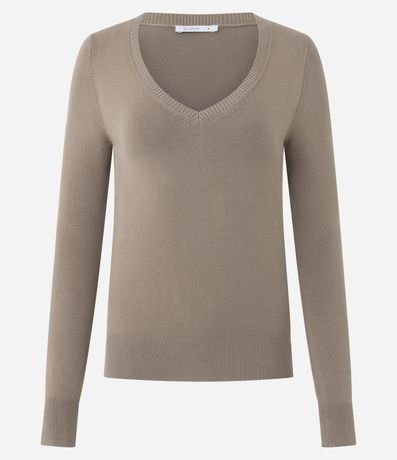 Blusa básica feminina confeccionada em tricô leve, sem estampa, com decote V e mangas longas. Possui textura canelada na gola.