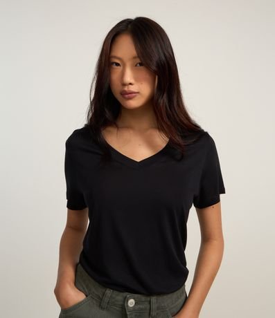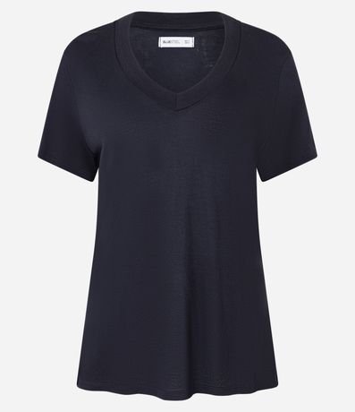 Ref: Blusa t-shirt confeccionada em viscose mais responsável, com decote V em ribana, mangas curtas e sem estampa.