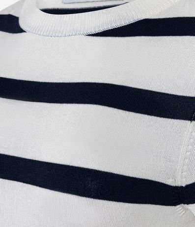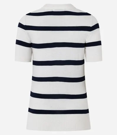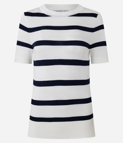 Blusa básica feminina confeccionada em tricô leve, com gola redonda, manga curta e padronagem de listras.