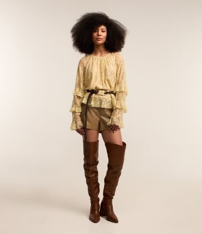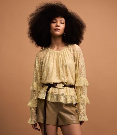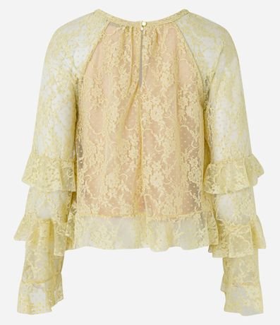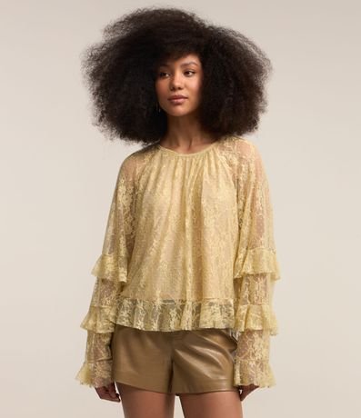Ref: Blusa bata, manga longa, textura floral, transparência nas mangas, fechamento gota nas costas e babados nas mangas e barra.
