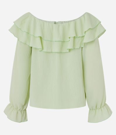 Ref: Blusa bata em alfaiataria com gola canoa, babados no busto e punhos, sem estampa e com amarração frontal.