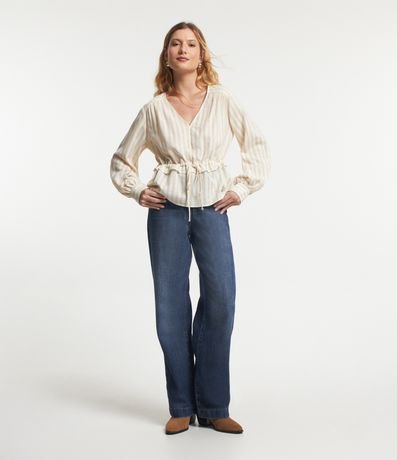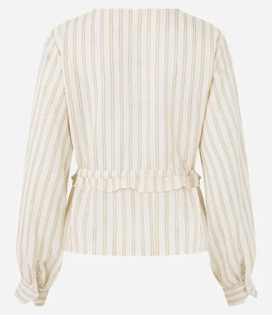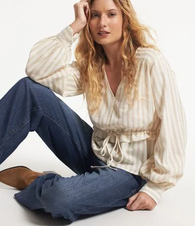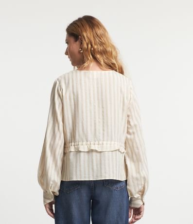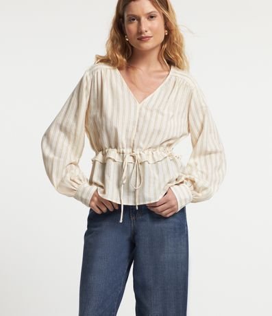Blusa bata feminina, confeccionada em cambraia, com decote V e mangas longas. A peça também conta com ajuste na cintura e estampa listrada com fio metalizado.
