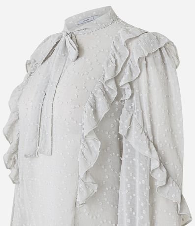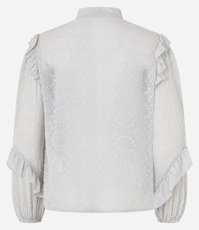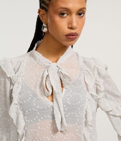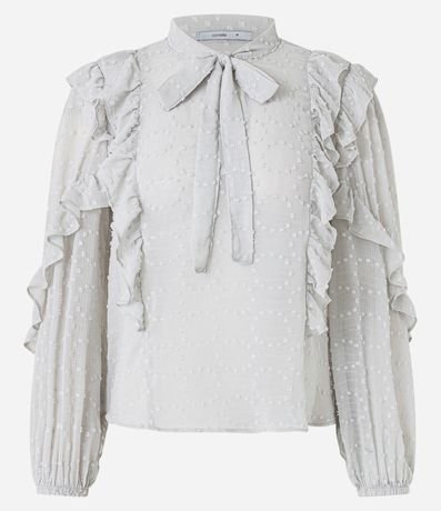 Blusa bata manga longa com golinha laço, confeccionada em chiffon e produzida em boas práticas ambientais, possui leve transparência e textura.