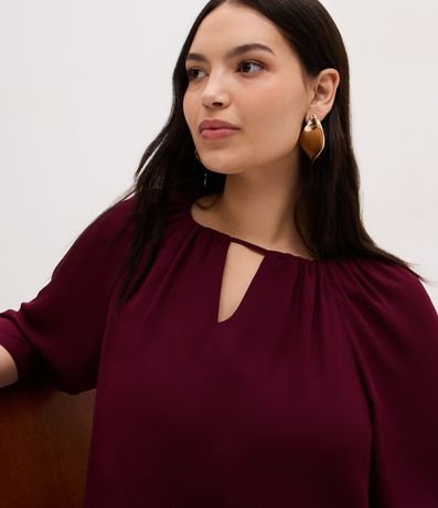 Blusa feminina plus size de modelo bata, confeccionada em crepe, com gola redonda e mangas 3/4. Sem estampa, possui recorte V no decote e franzidos na gola.