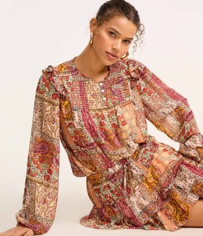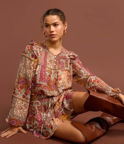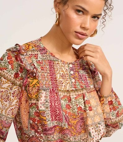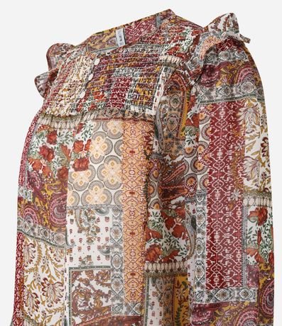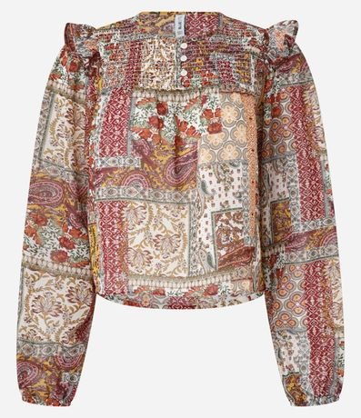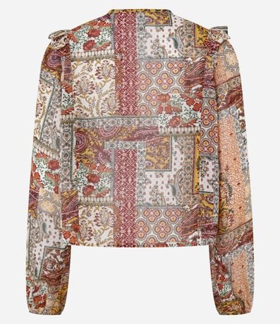 Blusa bata, curta com manga longa, pala em lastex com babado no ombro e estampa mix patch.