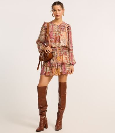 Blusa Bata em Curta em Chiffon com Pala em Lastex e Estampa Mix Patch