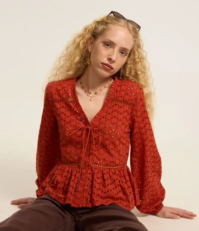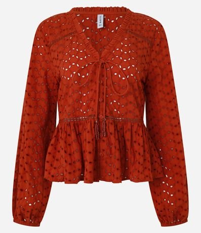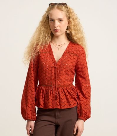 Bata feminina confeccionada em laise com decote V e mangas longas bufantes. Sem estampa, possui textura de furinhos, entremeios e babados.