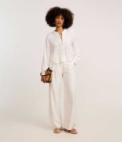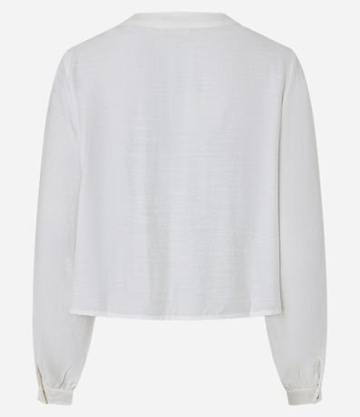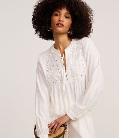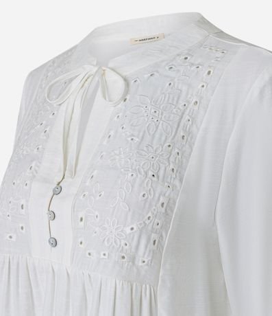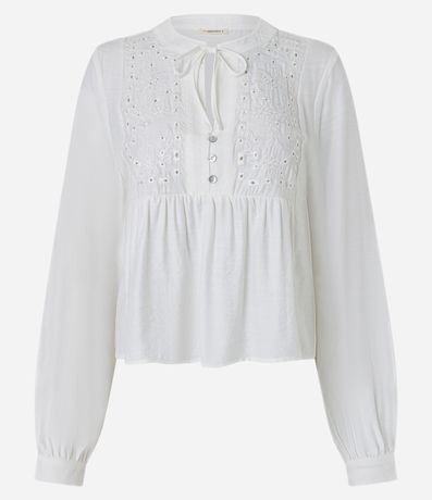 Ref: Blusa bata de mangas longas, confeccionada em viscose, com gola padre com amarração e botões, bordado floral no busto. Este produto possui viscose certificada em sua composição, sendo ambientalmente mais responsável.