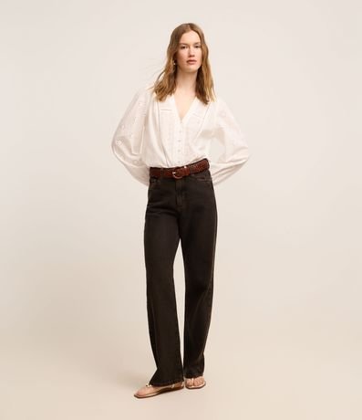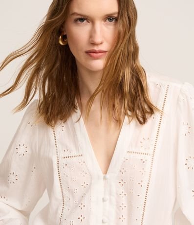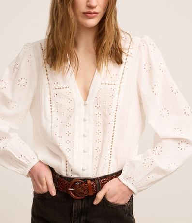 Blusa bata de mangas bufantes longas, confeccionada em laise, com decote V, botões frontais para fechamento e recortes de entremeios. Peça com pequenos vazados que formam padrões. Este produto possui algodão certificado BCI em sua composição, além de ter sido produzido através de processos mais sustentáveis, sendo ambientalmente mais responsável.
