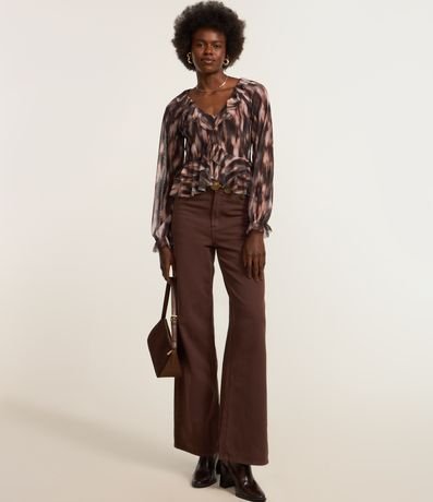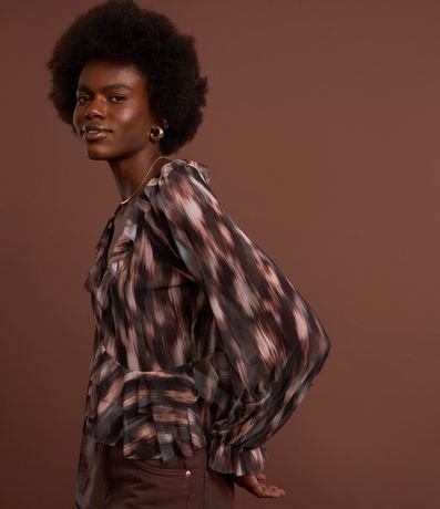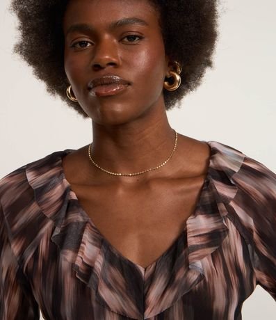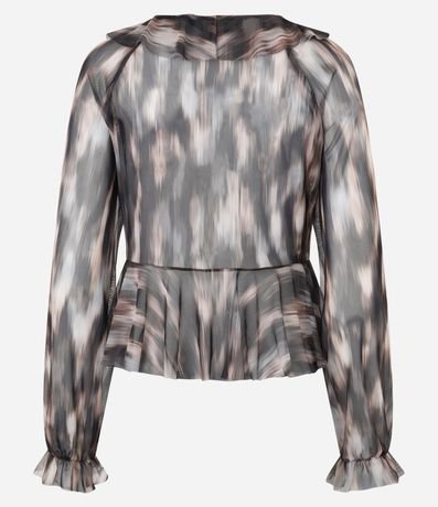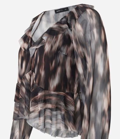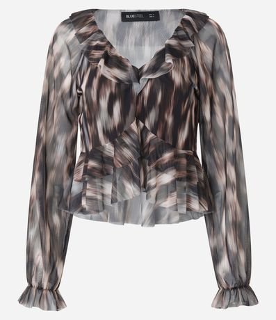 Blusa bata manga longa, confeccionada em tule através d boas práticas ambientais, estampa manchadinha bicolor e babados.