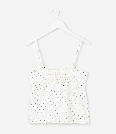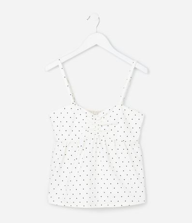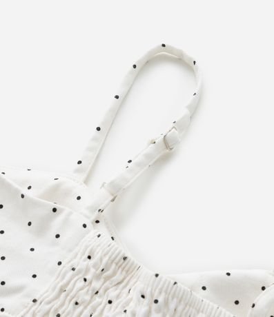 Ref: Blusa infantil confeccionada em sarja mais sustentável através de boas práticas ambientais, no modelo bata. Possui decote em u, com detalhe franzido, alças finas ajustáveis e estampa poá.