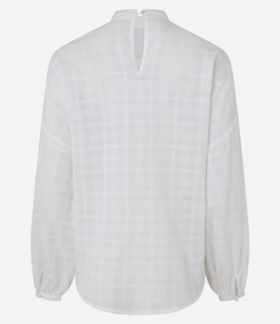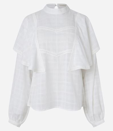 Ref: Blusa bata, toda confeccionada em algodão mais sustentável, com gola padre com fechamento gota. A peça tem babados robustos nos ombros, mangas longas com elásticos nos punhos, além de tecido todo maquinetada. A textura maquinetada é um tipo de textura que é feita na superfície da peça, através de máquinas que sobem e descem os fios.