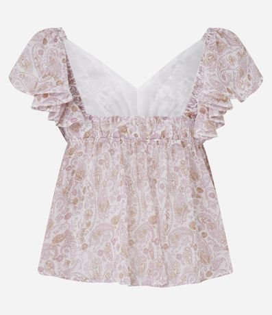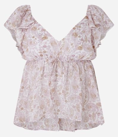 Ref: Blusa boho chic, modelo peplum, sem mangas, confeccionada em chiffon com babados nas cavas, decote V, costas com decote quadrado além de elástico na cintura e estampa paisley floral.