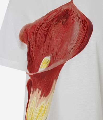 Ref: Blusa body de mangas amplas curtas, confeccionada em algodão, com gola redonda e estampa de flor de copo de leite em estilo de pintura a mão com costura aparente. Este produto possui algodão certificado BCI em sua composição, sendo ambientalmente mais responsável.