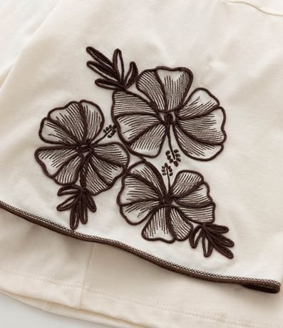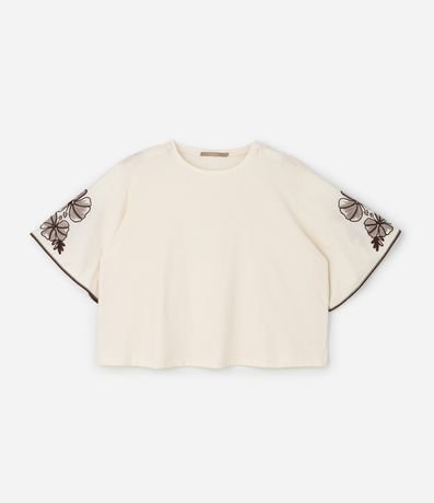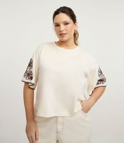 Ref: Blusa plus size confeccionada em malha de algodão mais responsável, de modelo boxy, com gola redonda e mangas curtas em corte godê. Possui detalhe de bordado floral nas mangas.