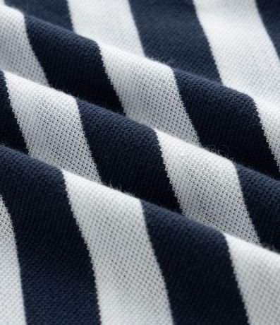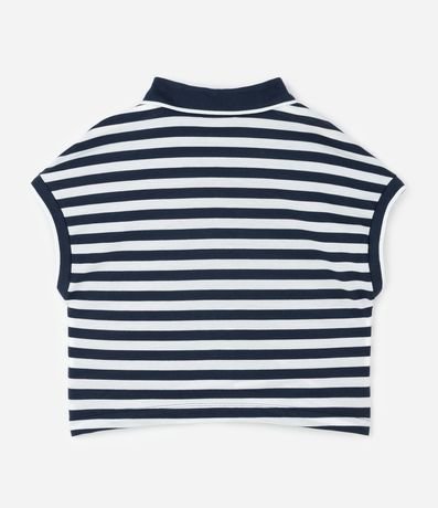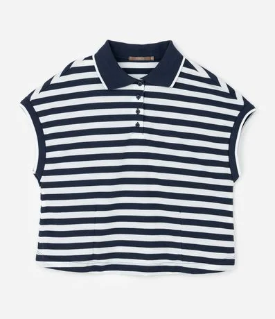 Blusa plus size de modelo boxy, confeccionada em malha piquet, com gola polo e mangas curtas. Possui padronagem listrada, sem cava, com detalhe de gola e barra das mangas contrastantes.