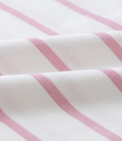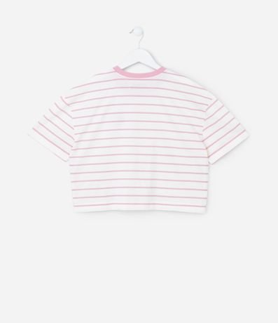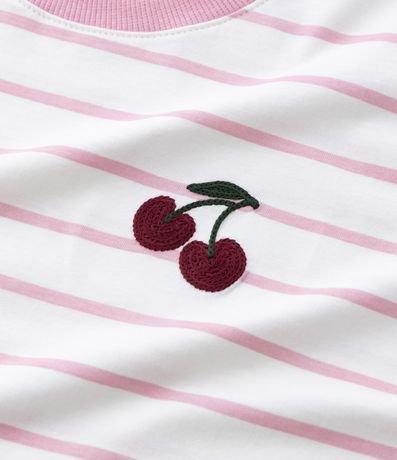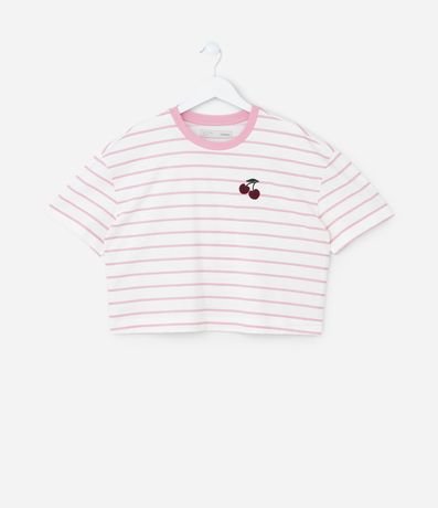 Blusa infantil confeccionada em algodão mais sustentável através de boas práticas ambientais, no modelo boxy. Possui gola redonda, contrastante, manga curta, estampa de listras e bordado de cerejinha.