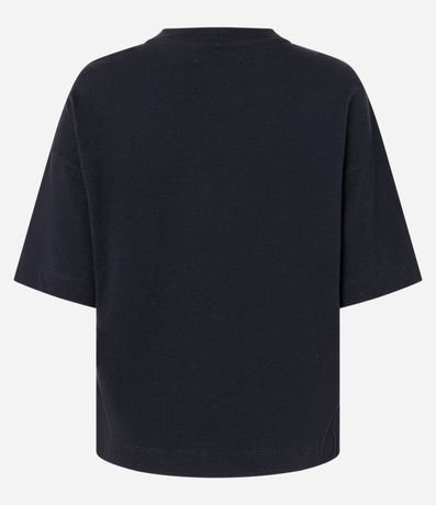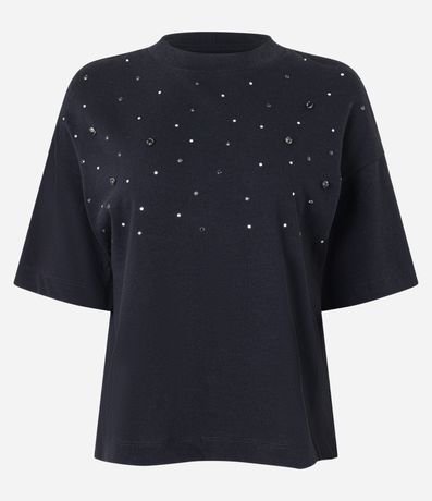 Blusa boxy ampla confeccionada em algodão com gola redonda levemente proeminente além de mangas curtas e pedrarias de strass aplicadas na região do busto.