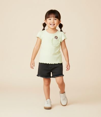 Ref: Blusa infantil confeccionada em algodão mais sustentável através de boas práticas ambientais. Possui gola redonda, manga curta, canelada, bolsinho, bordado da Skye e detalhes de frufru.