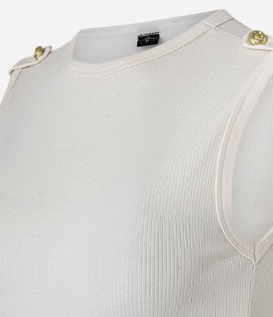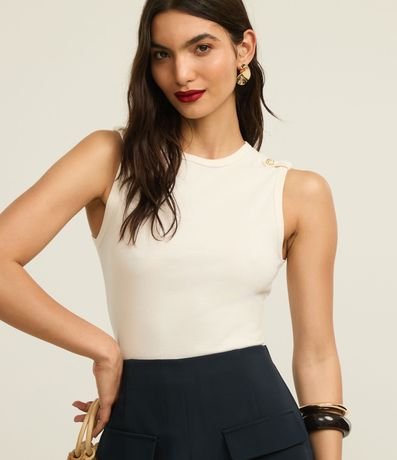 Ref: Blusa sem mangas, confeccionada em ribana, com textura canelada. A peça tem martingales - faixas com botões - nas alças. Este produto possui algodão certificado BCI em sua composição, sendo ambientalmente mais responsável.