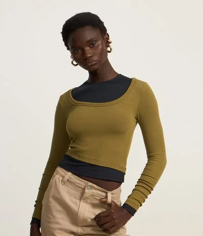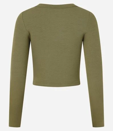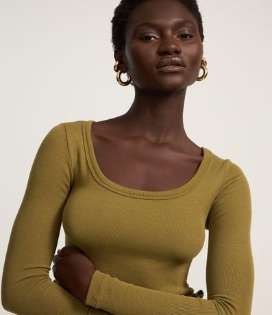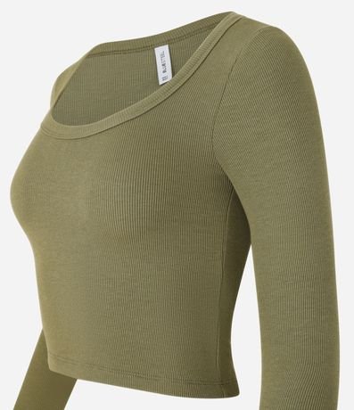 Ref: Blusa feminina curta, confeccionada em ribana de viscose, com decote redondo profundo e mangas longas. sem estampa, possui textura caneladinha.