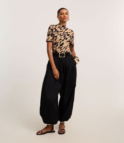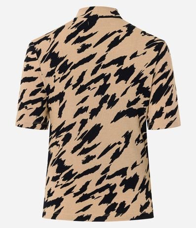 Ref: Blusa canelada de mangas curtas, confeccionada em ribana, com golinha alta e estampa de animal print de tigre. Peça bicolor. Este produto possui viscose certificada em sua composição, sendo ambientalmente mais responsável.