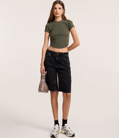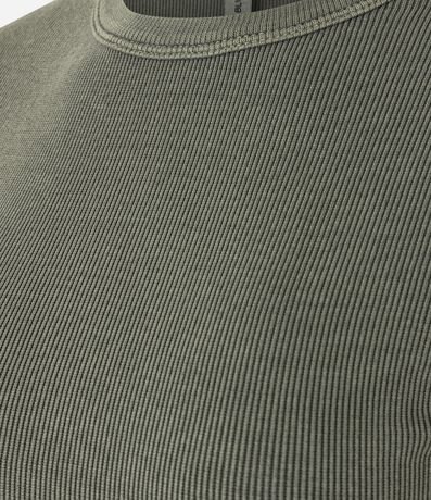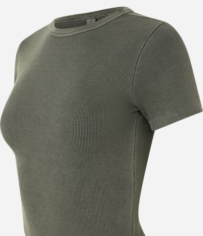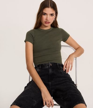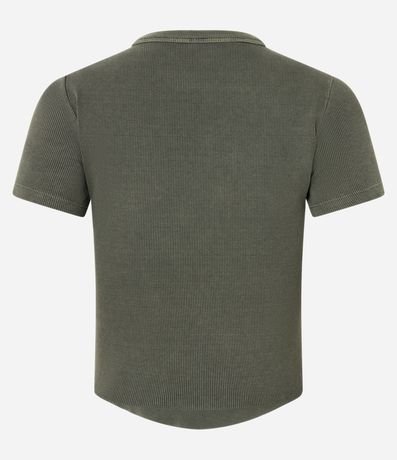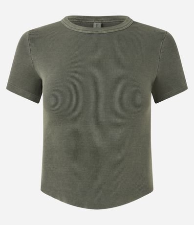Blusa de mangas curtas, confeccionada em ribana, com gola redonda e barra arredondada na parte frontal. Peça com lavagem estonada. Este produto possui algodão certificado em sua composição, sendo ambientalmente mais responsável.