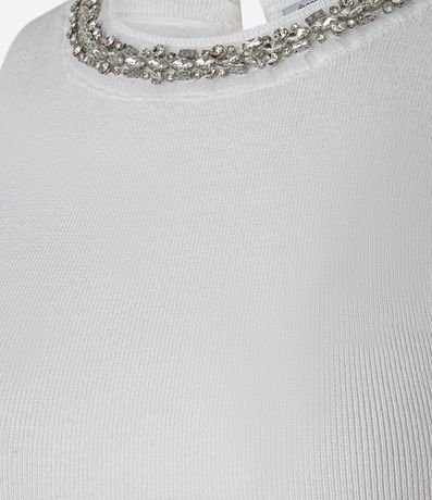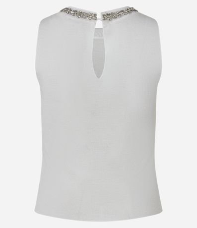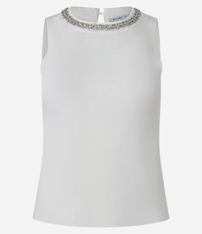 Ref: Blusa sem mangas, confeccionada em tricô canelado, com gola redonda com abertura por gota atrás. Inclui colar de pedrarias de strass na gola. Este produto possui viscose certificada em sua composição, sendo ambientalmente mais responsável.