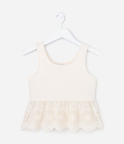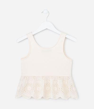 Ref: Blusa infantil confeccionada em algodão certificado bci, com textura canelada, alças largas e barra com babado em broderie.