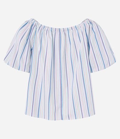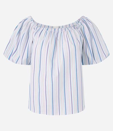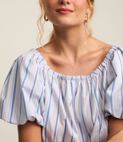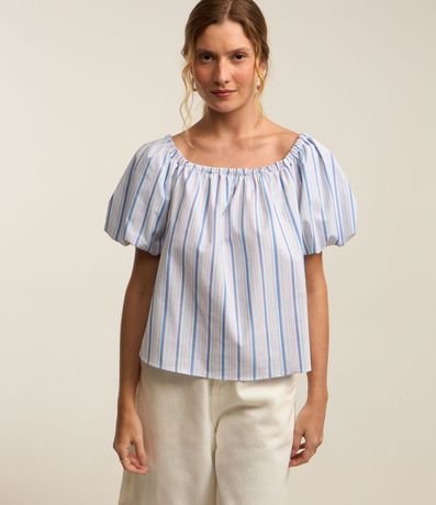 Ref: Blusa ciganinha feminina, confeccionada em tricoline, com mangas curtas balonê e estampa listrada.