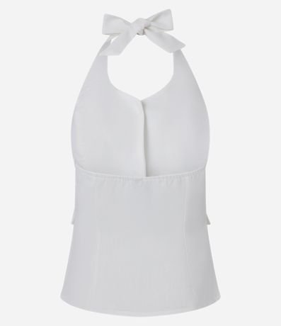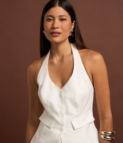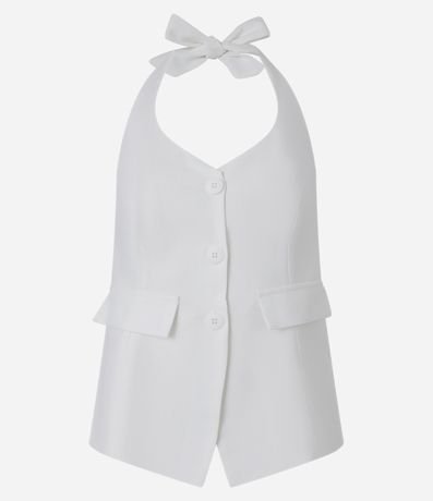 Ref: Blusa colete, frente única com amarração no pescoço, confeccionada em vicolinho, botões frontais e bolsinhos falsos com lapela.