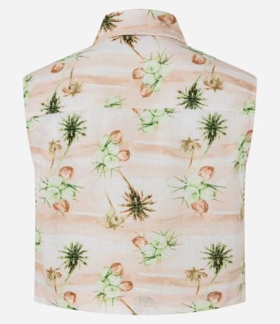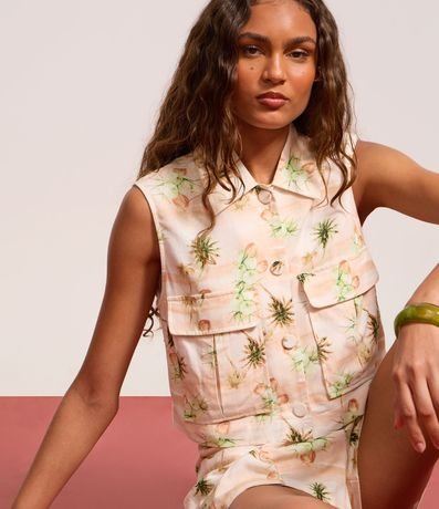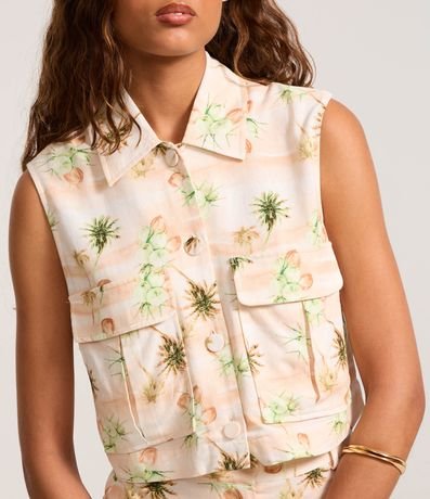 Ref: Blusa colete com gola colarinho, abotoamento frontal, confeccionada em viscose certificada com linho e estampa de folhagens.