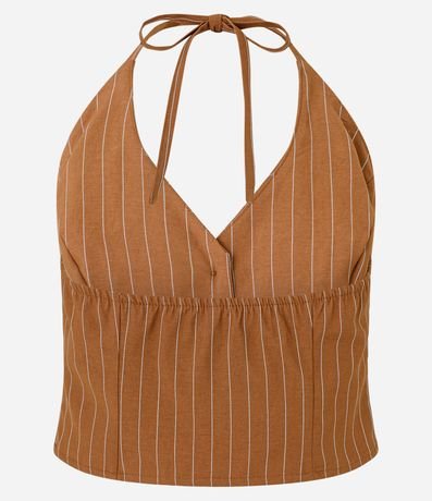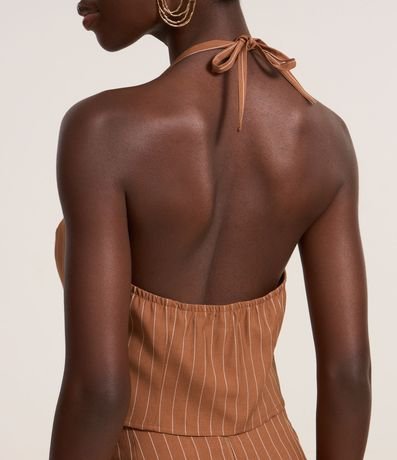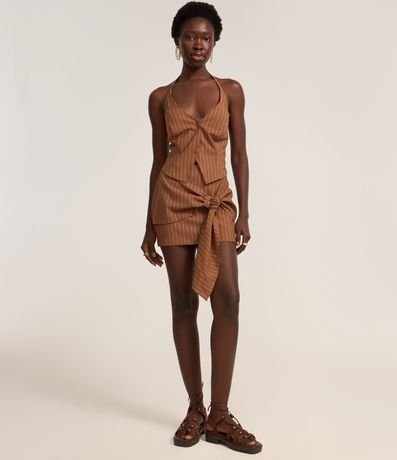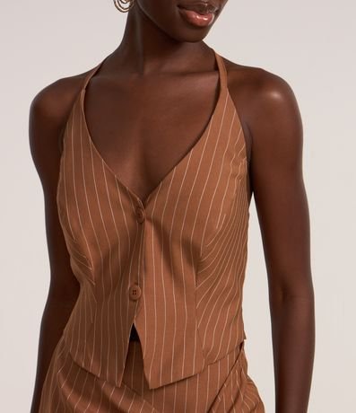 Ref: Blusa colete feminino em alfaiataria de viscose certificada com boas práticas ambientais, peça em frente única, amarração no pescoço, abotoamento frontal e risca de giz.