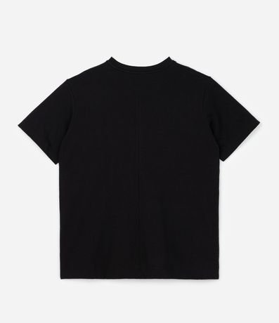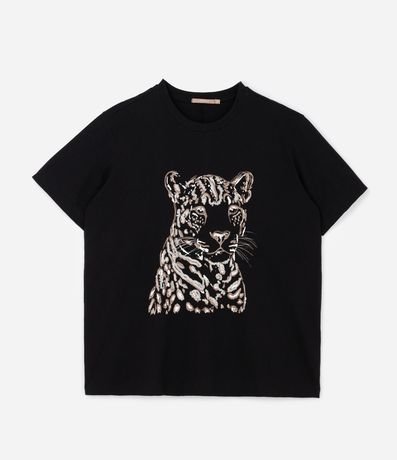 Blusa feminina Curve & Plus Size confeccionada em algodão mais sustentável com boas práticas ambientais, peça com gola redonda, manga curta. Uma estampa bordada de onça, com animal print e paetês.