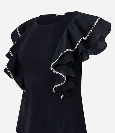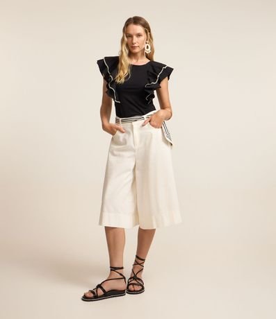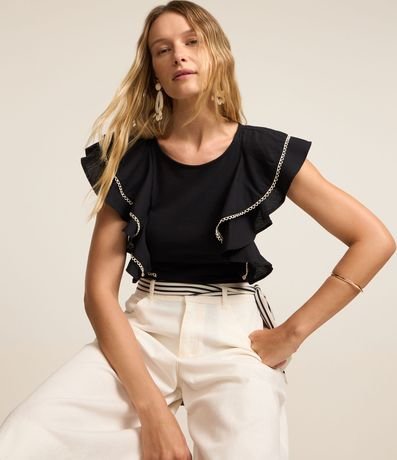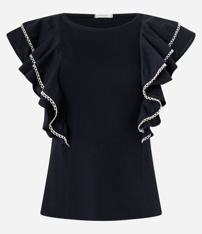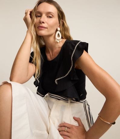 Ref: Blusa feminina confeccionada em algodão, com gola redonda e sem mangas. Possui babados grandes nas cavas e detalhe em pespontos contrastantes.