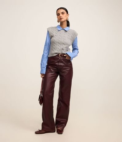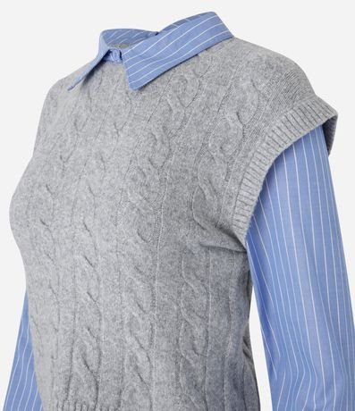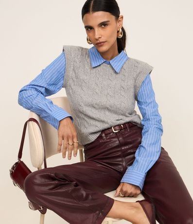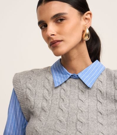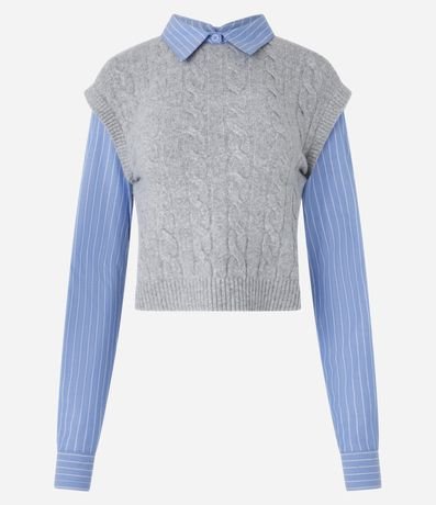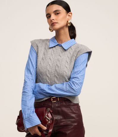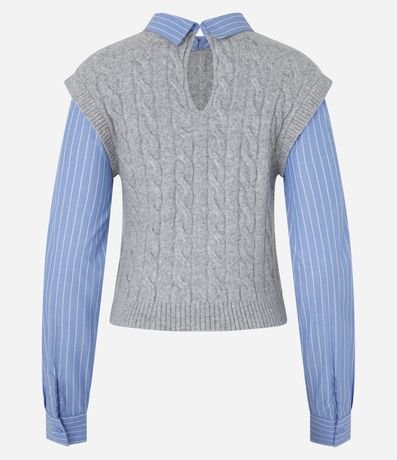 Ref: Blusa comfort, confeccionada em tricô com caimento leve, com colarinho na gola e mangas longas, ambas listradas. A peça bastante diferenciada, possui colete sobreposto com mix de pontos de tricô.