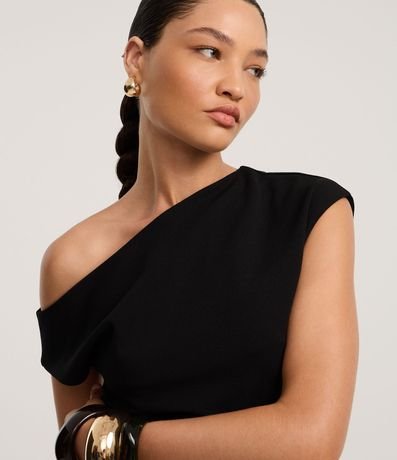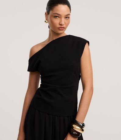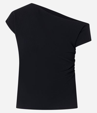 Ref: Blusa feminina confeccionada em crepe com decote assimétrico, manga curta e drapeado lateral.