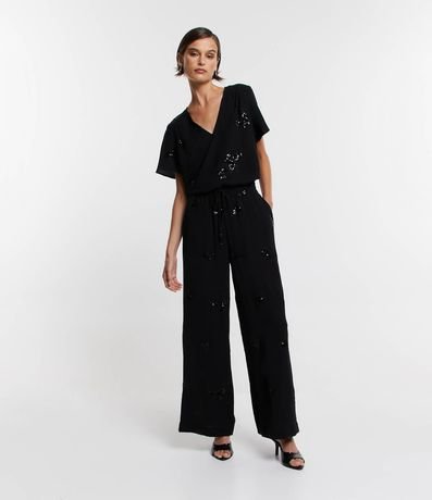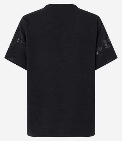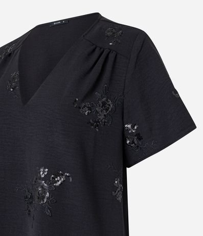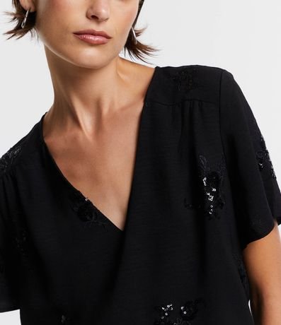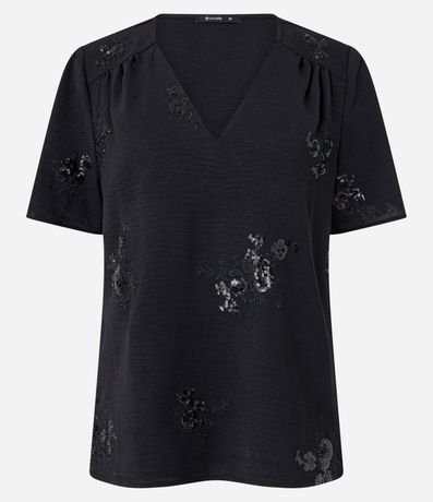Ref: Blusa com decote V, mangas curtas e bordado paetê.