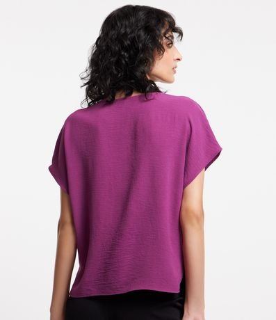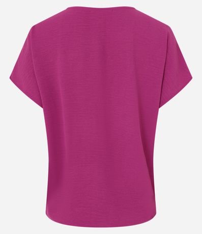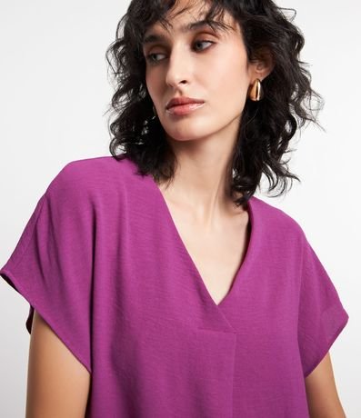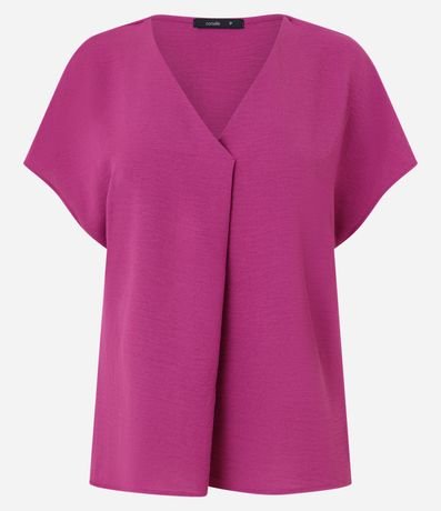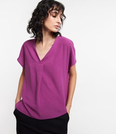 Blusa feminina, com decote V, fechamento frontal e mangas curtas.