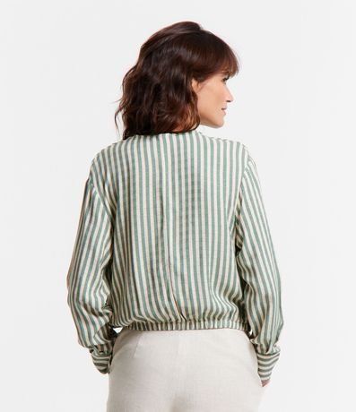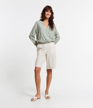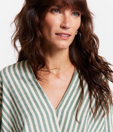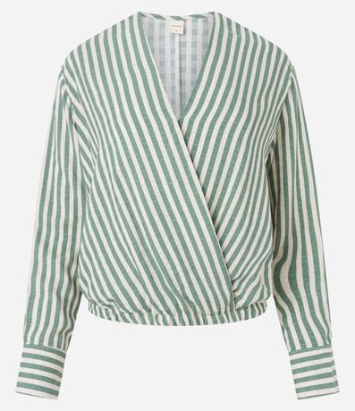 Blusa feminina, confeccionada em tecido maquinetado, com decote V transpassado e mangas longas. A peça também conta com estampa listrada e detalhes em fio metalizado.