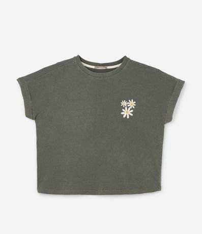 Ref: Blusa feminina Curve & Plus Size confeccionada em algodão certificado bci, peça com gola redonda, manga curta, fio tinto e estampa bordada de margaridas.
