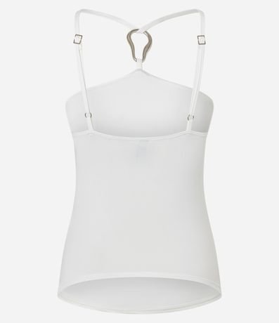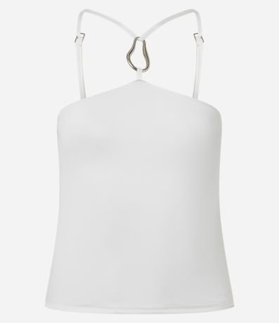 Blusa feminina confeccionada em microfibra através de processo mais sustentável, possui gola halter, com aviamento no centro, alças finas, ajustáveis e sem estampa.