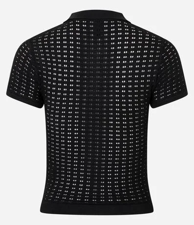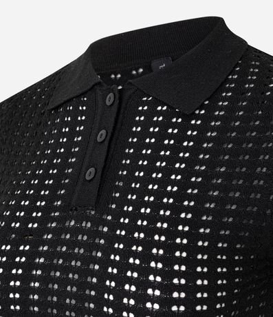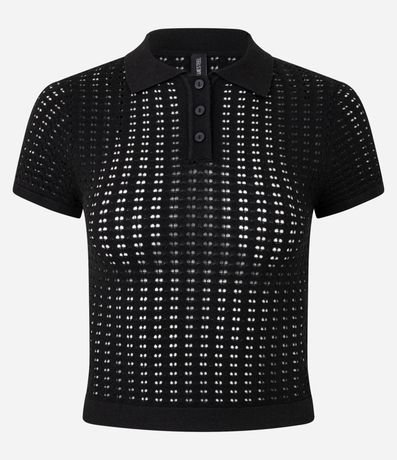 Ref: Blusa feminina em tricô com gola polo, manga curta. Peça no estilo ponto aberto com transparência.