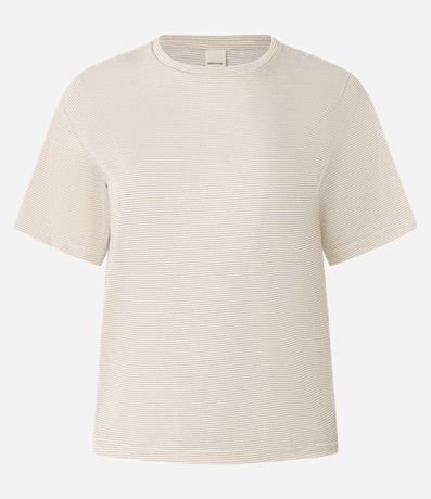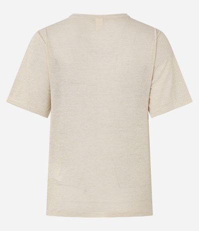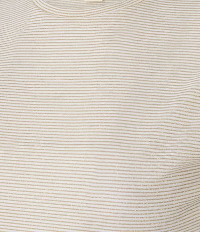 Blusa de mangas curta, em malha, com decote redondo e listras horizontais metalizadas. Este produto possui viscose certificada em sua composição, sendo ambientalmente mais responsável.