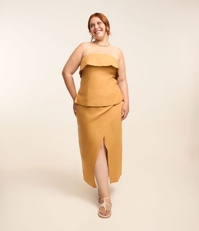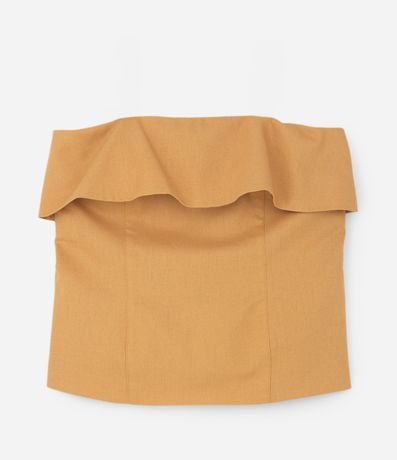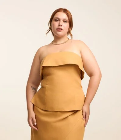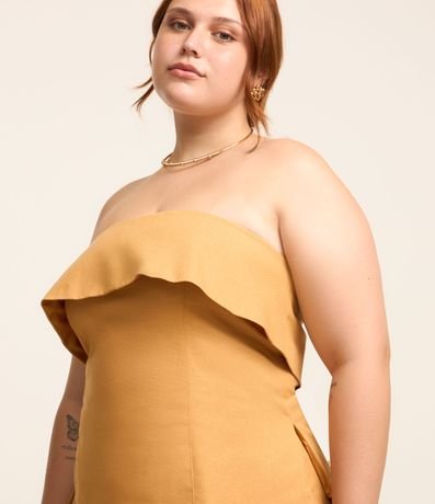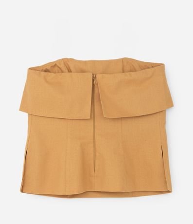 Blusa sem alças e sem estampa confeccionada em tecido com viscose e linho. A peça deixa os ombros livres e tem detalhes especiais como lapela sobreposta no busto e fendinhas laterais. O fechamento é nas costas por zíper.