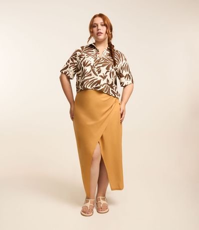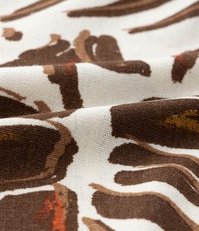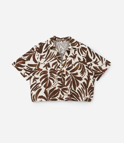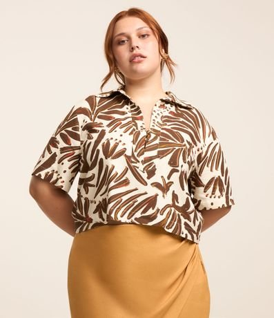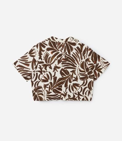 Ref: Blusa confeccionada em viscose mais sustentável e linho, estampada de folhagens. A peça tem mangas curtas, gola camisa e decote V com botõezinhos.